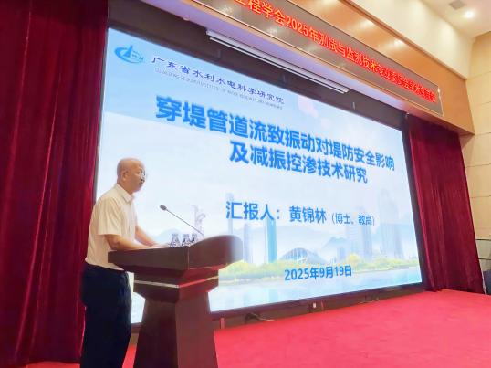广东省水利水电科学研究院副总工程师黄锦林教授级高工作了《穿堤管道流致振动对堤防安全影响及减振控渗技术研究》的报告。针对穿堤管道流致振动威胁堤防安全的技术难题,他深入阐述了团队开展的系列研究:包括穿堤管道振动特征信息提取、振源特性及传递规律分析、振动影响范围数值模拟等基础研究,基于模型试验的管道振动特性及减振措施研究,以及振动对堤防渗流与边坡稳定的影响分析、管道运行安全动力学监测预警技术探讨等应用研究。最终提出的穿堤管道减振控渗措施及运行安全监测预警技术,为穿堤管道工程的长期安全运行提供了坚实的技术保障。